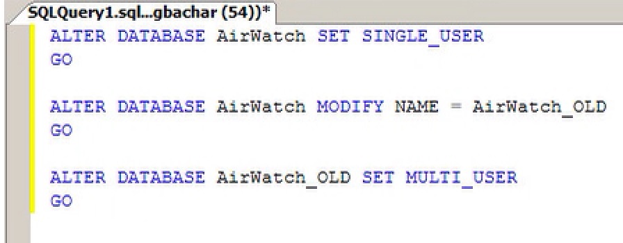 Rename the old database, for example, to AirWatch_OLD. To kill all connections and rename the database, run the following script, replacing ‘AirWatch’ with the name of your old AirWatch DB and AirWatch_OLD with what you would like to rename the old database to.